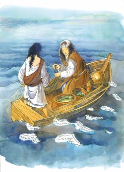 Jitro ještě dávno nezačalo a chlapci vypluli. Věděli, že otec bude mít toho dne povinnost mimo dům a nebude své syny hledat. Ale i kdyby. Než vyjde slunce nad obzor, budou i s bohatým úlovkem zpět u břehu. Když si mysleli, že jsou už dost daleko na hladině, rozhodili sítě. Vesla neslyšně zvrátili do člunu a tiše čekali.