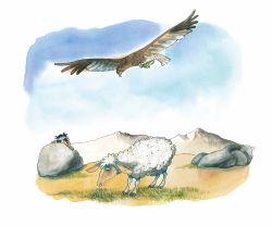 Nešťastný pád ovce do studny, to se nestávalo často. Ještě že vody v ní bylo jen tak po kole-na. Vlastně se stala podobná příhoda vůbec poprvé, pokud se pastýři pamatují. To daleko častěji, vlastně každou chvíli, hrozilo ovčímu stádu nebezpečí shůry. Tím nebezpečím byl orel. Hnízdil na vysoké skále, a jeho starosti o to, aby denně nakrmil svá dvě mláďata, mu měly ulehčit pasoucí se ovečky, roztroušené po pastvinách. Často nad nimi kroužil a pátral po kořisti. Vyhlížel, jestli se některá z oveček nevzdálila od stáda, jestli některá neunikla pozornosti pastýřů, aby se na ni mohl vrhnout a uchvátit ji.