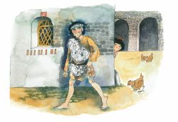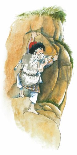 Asaf právě stojí pod strmou skálou. A právě sem, z opačné strany přiběhne i Mista. Asaf vklouzne hlavou pod ovci a vysadí si ji na ramena. ^Nevzpouzej se, Misto!" šeptne Asaf a už šplhá i s břemenem po skále vzhůru. Ví, že tam se za ním líný Elíab šplhat nebude.